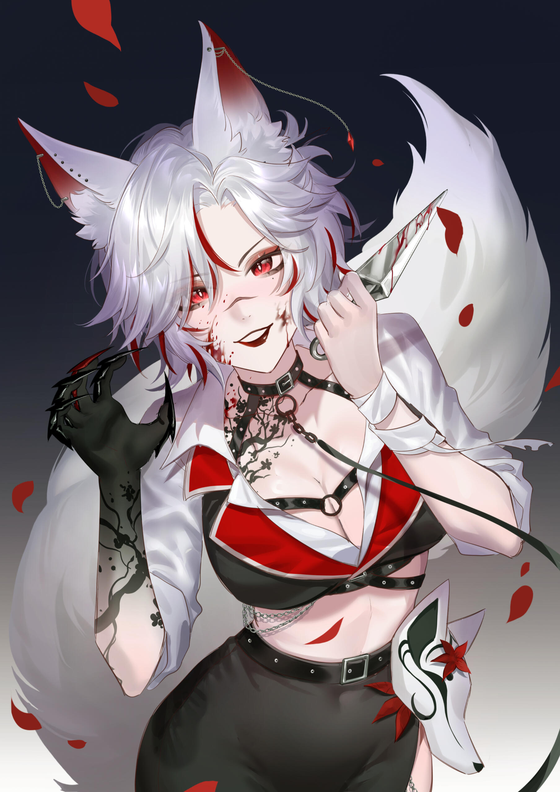 “I was so scared… everything hurt so much… Death felt so real and I thought I was going to lose you forever. Thank you, thank you. I love you so so much.” I say as I kiss him. We pull away to find the puncture wound still in my chest, but my skin and muscles beginning to regenerate. Nyght looks at me with tears in his eyes and a subtle smirk, “How’s it feel to be immortal..?”Through an intense recovery process and getting adjusted to the burning venom in my veins and an insatiable thirst, I became what I am today. A half Kitsune, half Vampire Assassin with a renewed vigor and unsatiated bloodlust for revenge. Nyght and I’s bond grew stronger than ever and we are now the unstoppable forces that keep our Lunatics safe.